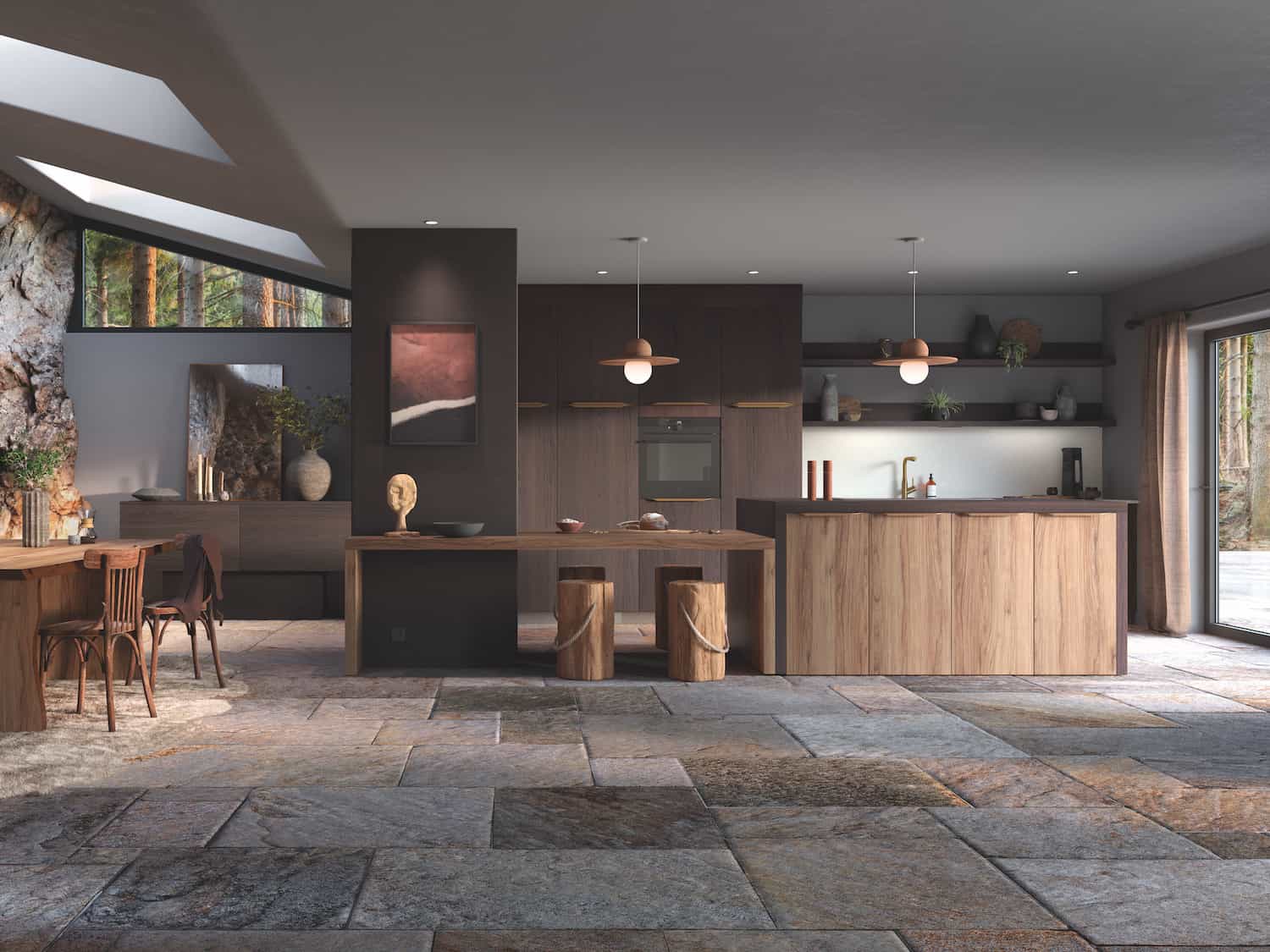 L’association des deux décors bois (le décor “Noyer Orlando foncé” pour les armoires, les tablettes et les finitions ; le décor “Noyer Regia clair” pour les meubles en partie basse du linéaire et celles de l’îlot), conjuguée au toucher structuré de ces deux mélaminés, évoquent l’esprit « atelier d’artisanat d’art ». Quant à la palette contrastée des coloris des façades (décor bois clair naturel brut pour le noyer Regia ; veinage sombre et chatoyant constellé de touches de rouge sombre pour le décor noyer Orlando), elle apporte lumière et profondeur.