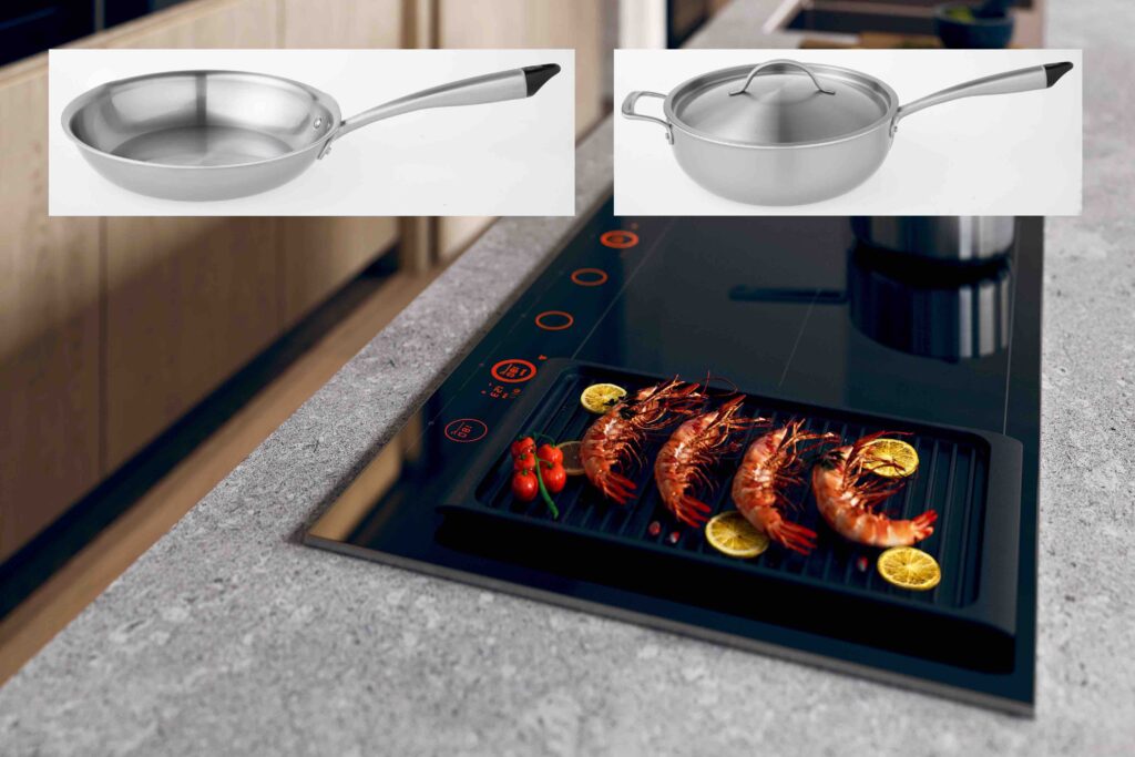 Effectivement, outre les sept modèles de tables aujourd’hui disponibles [deux tables 4 zones (72 cm), une table 5 zones (90 cm), deux tables 6 zones (90 cm), une table panoramique 4 zones (111 cm) et un domino 2 zones (38 cm) pour les petites cuisines ou pour compléter un plan de cuisson existant], sans oublier la sonde culinaire de contrôle de la température citée plus haut (fournie de série), la gamme “Celsius° Cooking” peut élargir son territoire d’expression, ceci grâce à l’ajout de deux récipients en inox dotés d’un capteur intégré au fond du récipient, qui peuvent être achetés par la suite, lorsque l’utilisateur souhaite « monter en compétences » dans l’utilisation de sa table. Il s’agit à ce jour d’une poêle (28 cm de diamètre) et d’une sauteuse (29,5 cm), fabriquées par un industriel partenaire thaïlandais.