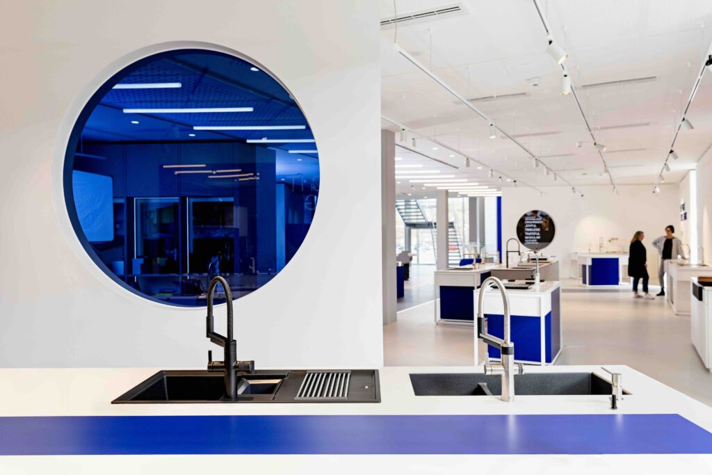Au sein du nouveau “Brand Experience Center”, les visiteurs peuvent (entre autres expériences) tester toutes les possibilités d’aménagement du point d’eau de cuisine avec Blanco.