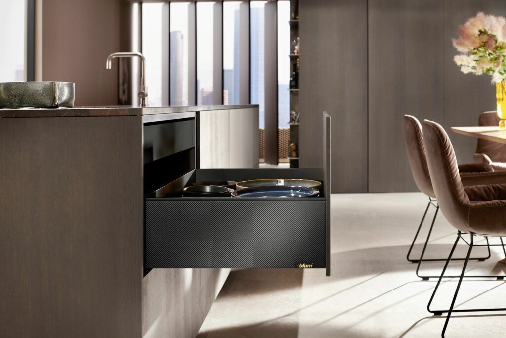 Dans un autre domaine et avec son tiroir métallique “Légrabox”, le spécialiste des ferrures dit vouloir répondre « aux exigences particulièrement élevées en matière de design individuel ». Dans cet esprit, outre les programmes traditionnels “Légrabox pure”, avec ses côtés métalliques fermés et “Légrabox free”, avec inserts en verre ou personnalisés, Blum propose désormais deux nouveaux niveaux de conception :