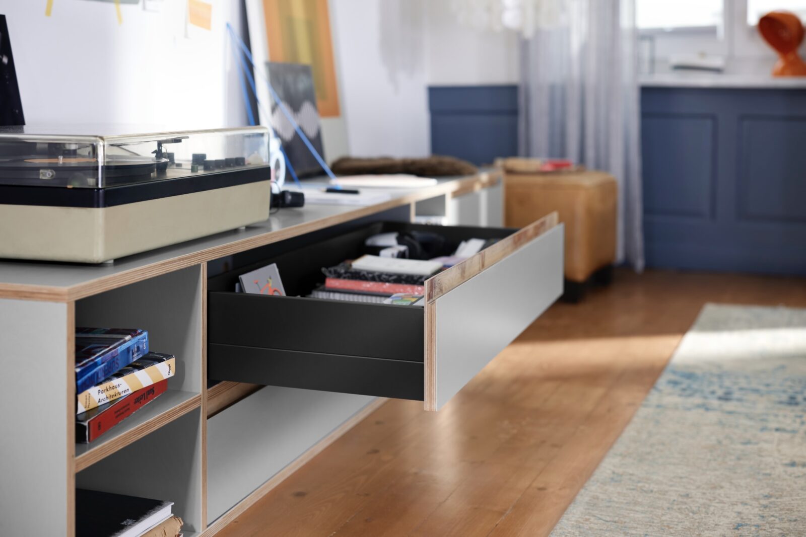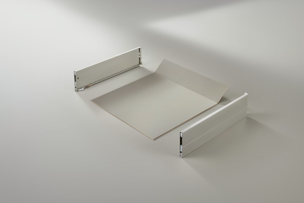 Au cœur de ce système : le fond pliant, qui a été développé par Blum en collaboration avec Egger, spécialiste du bois dans le Tyrol, qui se charge également de la production. Il sert à la fois de fond et de dos, et permet de mettre en œuvre et d’assembler le système Box en un tour de main, selon la devise « Plier. Pousser. C’est terminé. ». Il suffit en effet d’enfoncer le fond pliant dans les côtés et de le fixer sans outil. Il ne reste plus qu’à monter les coulisses corps de meuble, qui peuvent être utilisées aussi bien pour les côtés métalliques de PLICOBOX que pour les tiroirs bois. Le système est disponible en trois couleurs tendance et s’intègre parfaitement dans le style des meubles modernes avec son design élancé.