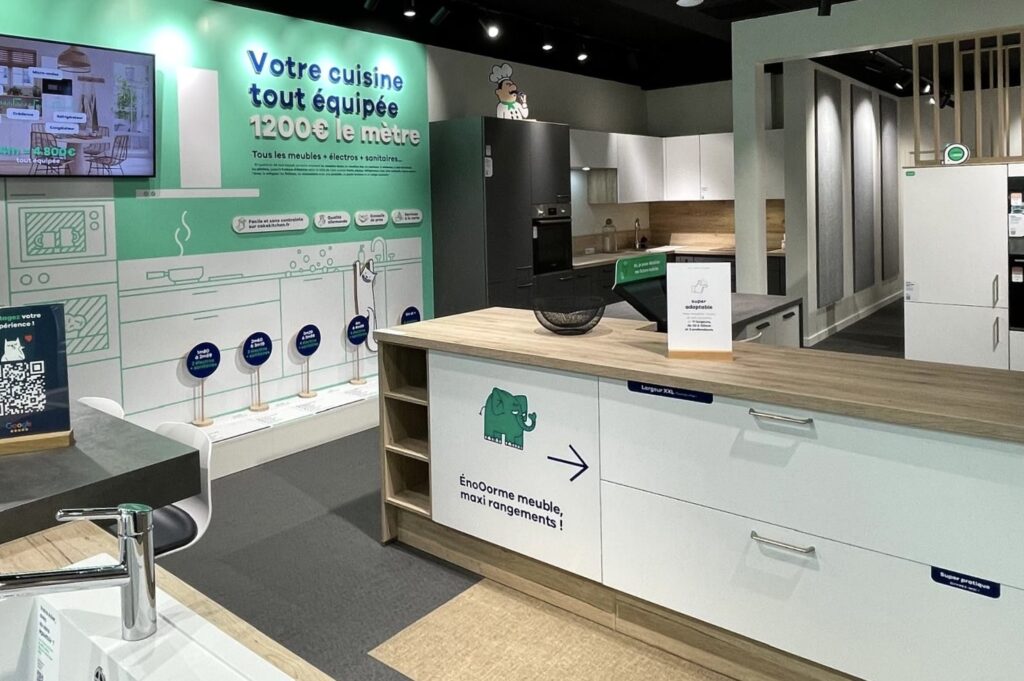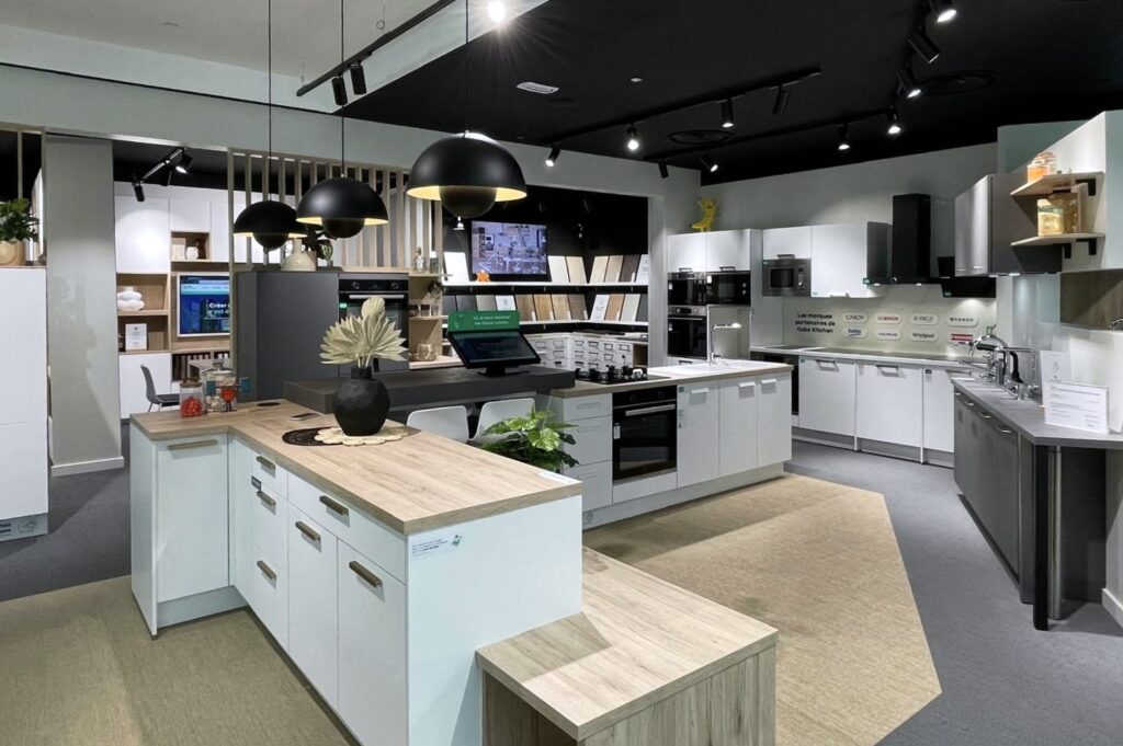 Avec une surface de 140 m2, le magasin se découpe en cinq espaces, « qui ont pour vocation de permettre de découvrir son concept unique, avance le communiqué cité plus haut, puis d’apprécier la qualité de ses créations, à travers la présentation de l’ensemble des meubles de sa gamme de cuisines, des échantillons de finitions, des poignées, ainsi que d’une sélection d’électroménagers, de sanitaires et de robinetteries de marques de référence ».