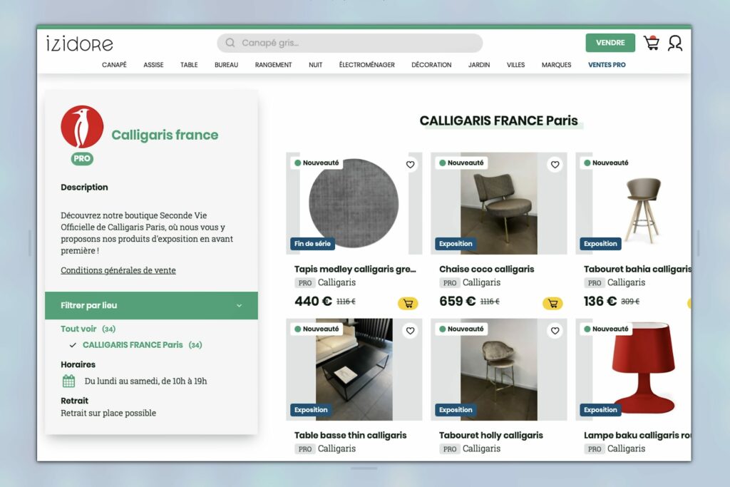 « Calligaris confie la revente de ses produits d’exposition à izidore et rejoint ainsi les 250 magasins professionnels revendeurs sur izidore.com », résume le communiqué dédié à cette annonce.