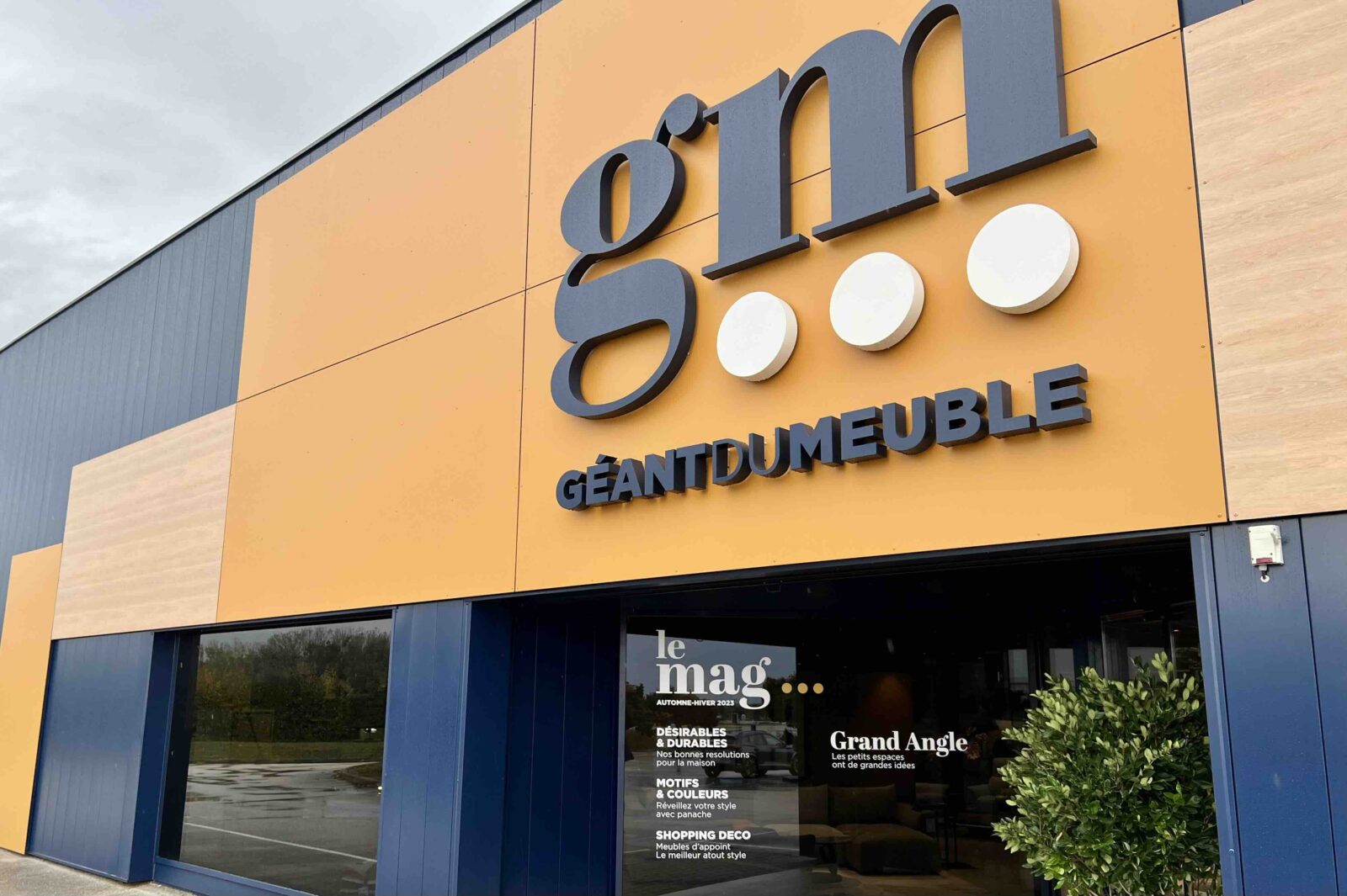 Premier élément d’attractivité et partie sans doute la plus visible de l’iceberg : une façade inédite (« conversationnelle » si l’on en croit les pros du marketing, “interactive” pour le commun des mortels), qui arbore la nouvelle identité visuelle du Géant du Meuble. Celle-ci se compose dorénavant de deux couleurs volontairement différenciantes des acteurs concurrents (un bleu et un ocre, des coloris déposés, propriétés du groupement), combinées au blanc de trois gros points de suspension (désormais véritables “gimmicks” graphiques de l’enseigne), aux deux imposantes initiales “gm”(en caractères minuscules), au maintien (en lettres capitales cette fois) de la marque “Géant du Meuble” (positionnée comme “baseline” de l’ensemble), à la mention du nom patronymique (qui sera maintenu lorsqu’il est synonyme d’une vraie notoriété locale, et seulement dans ce cas de figure) ; le tout associé à un pan de bardage en bois, qui tranche de la plus belle des manières avec les à-plats bleu et ocre.