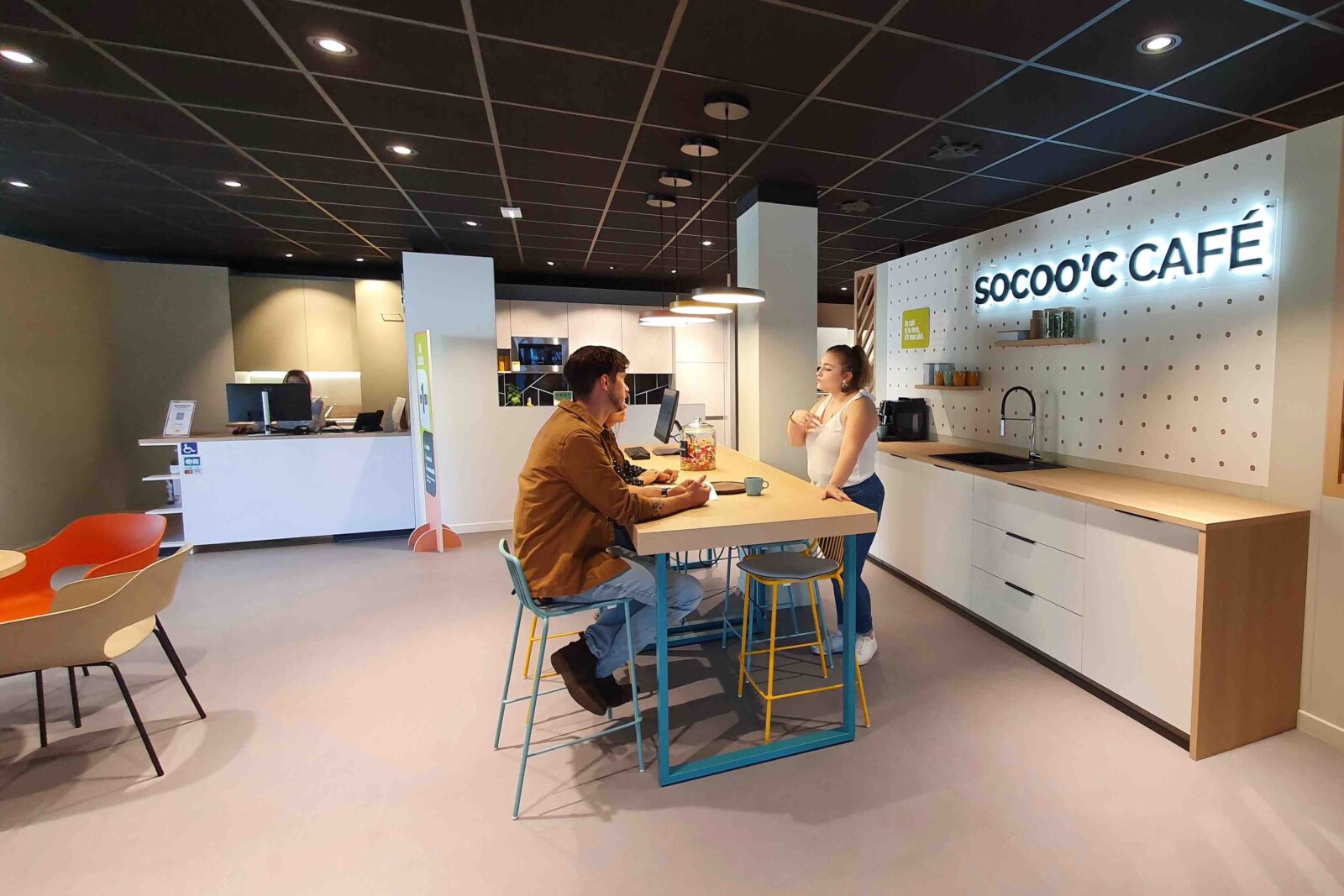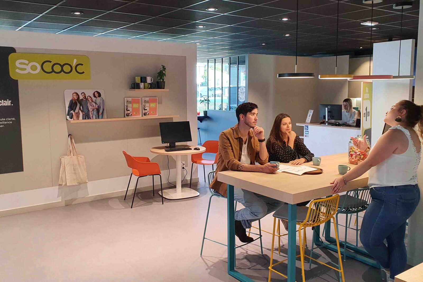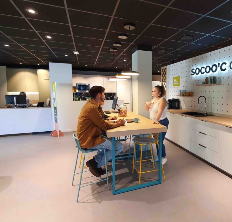 Parce que SoCoo’c a toujours affirmé sa différence, son concept magasin n’est pas un showroom intégrant un espace de vente, mais plutôt un lieu de collaboration et de partage (la fameuse “co-conception” !) au service d’un seul et même projet : celui du client. « Le concept “HOP” renforce cette posture collaborative dès le début du parcours client, grâce à un espace “co-work” regroupant le SoCoo’c Café, l’espace choix et les deux espaces de co-conception du projet », explique Muriel Charbonnel, responsable “Service Agencement et Design Commercial” chez SoCoo’c.