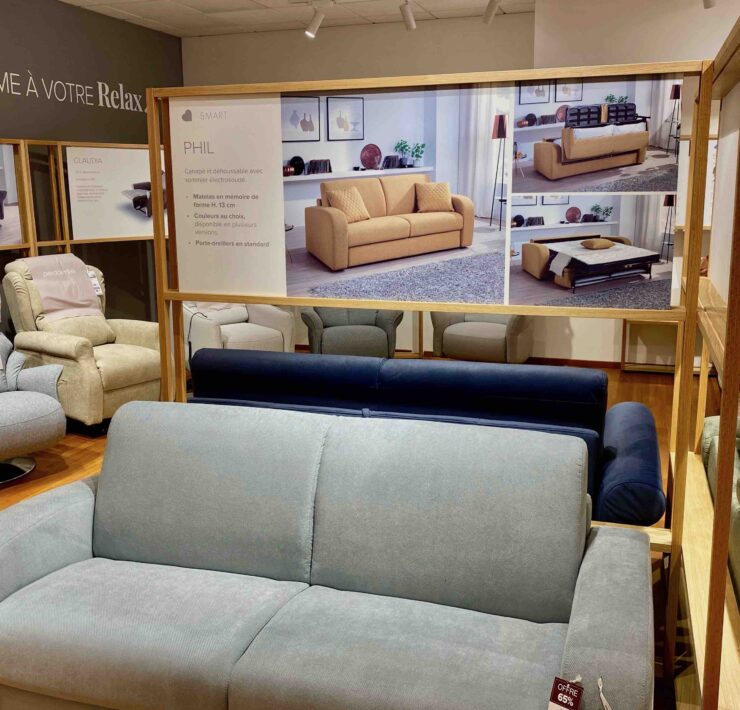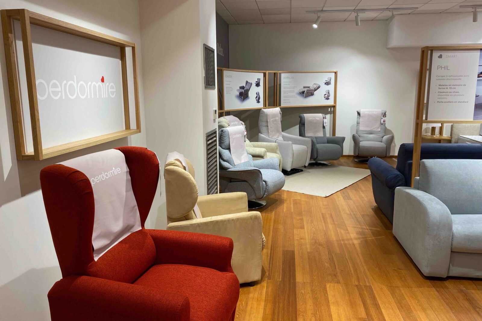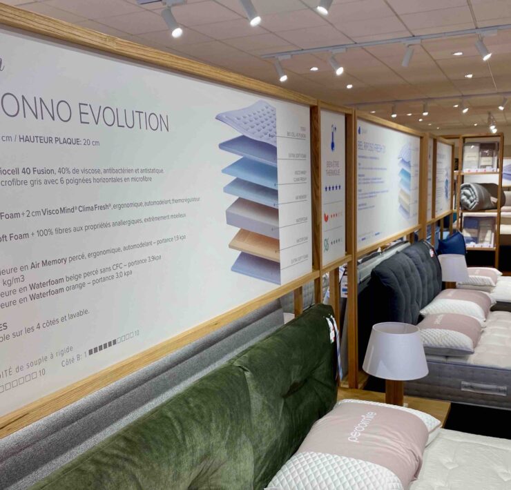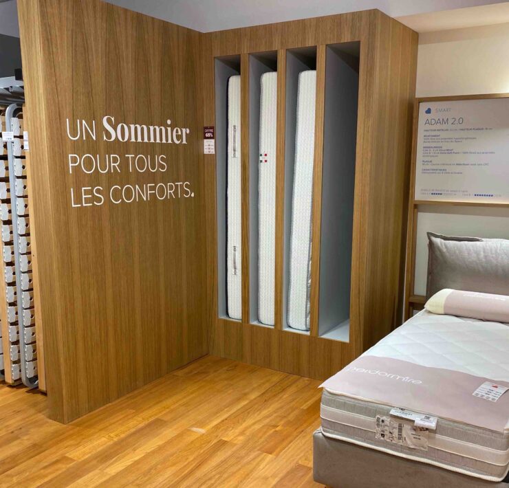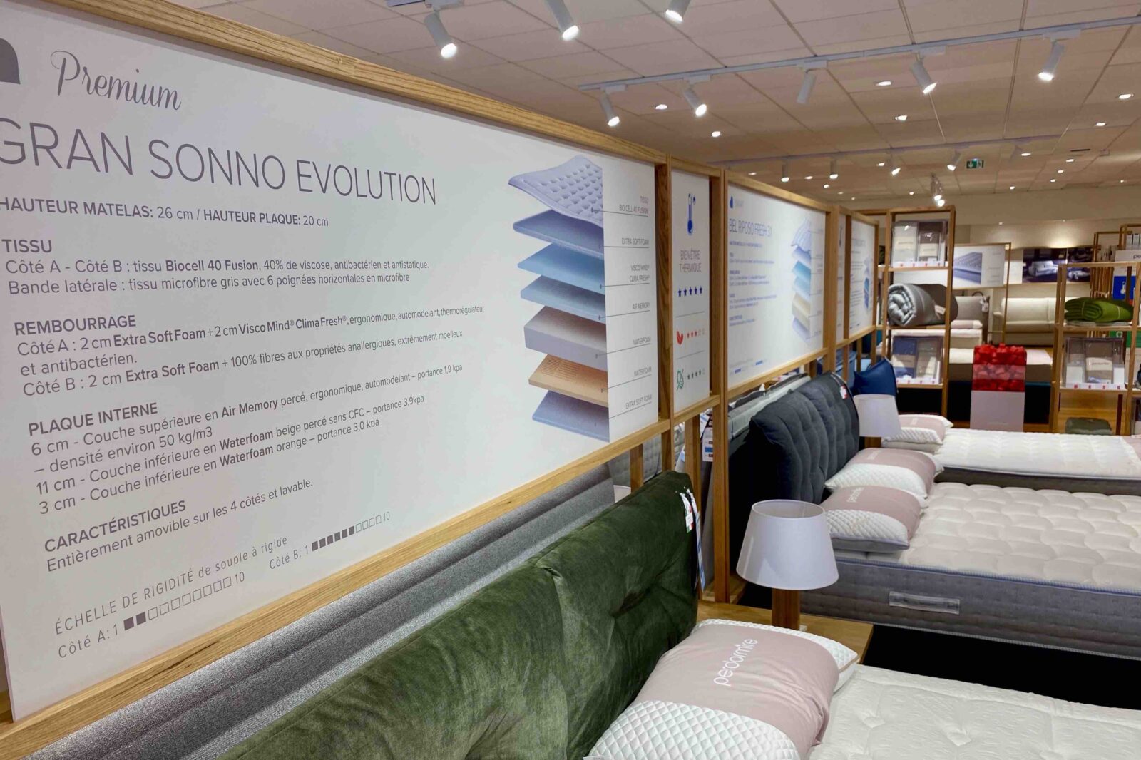 À noter : l’assortiment s’avère 100 % italien (“italianité” oblige !) et, excepté le linge de lit, les protège-matelas, les protections de sommiers, les édredons, les parures de draps et quelques autres accessoires, une très grande partie des produits sort des usines Materassificio Montalese ; y compris – ce n’est pas anodin – les différents oreillers proposés à la vente, ainsi que quelques fauteuils relax et les canapés-lits. Concernant ces derniers produits, signalons ici que l’offre “siège” est disposée au fond du point de vente. Le concept PerDormire n’impose aucun parcours fléché à ses clients. La stratégie de l’Italien consiste à laisser le consommateur découvrir seul l’offre du magasin, au moins dans un premier temps ; avant que le/la vendeur(euse) n’identifie les attentes du chaland et ne l’oriente vers les solutions les mieux adaptées à ses besoins (et à son budget). L’agencement, les cloisons ajourées, les meubles de présentation, les outils d’ILV et de PLV… : tous les éléments du concept, valorisés par un éclairage particulièrement soigné et efficace, incitent à la découverte et au coup de… cœur, symbole/gimmick qui, faut-il le rappeler ?, fait partie intégrante du logo de l’enseigne.