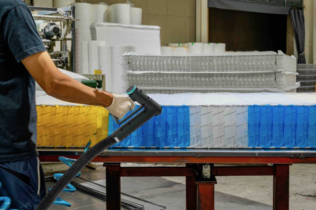 « L’adhésif thermofusible est sans conteste la solution de collage la plus employée dans la fabrication des matelas, explique-t-il. Elle apparaît en outre comme la plus aisée à intégrer dans les processus de production automatisés, ceci grâce à un séchage quasi immédiat. L’utilisation d’une colle ou d’une autre dépend du type de production. Or Meler dispose d’un tel savoir-faire, spécialisé dans les applications de colles thermofusibles, qu’il est en mesure de proposer des solutions complètes, adaptées à chaque fabricant ».