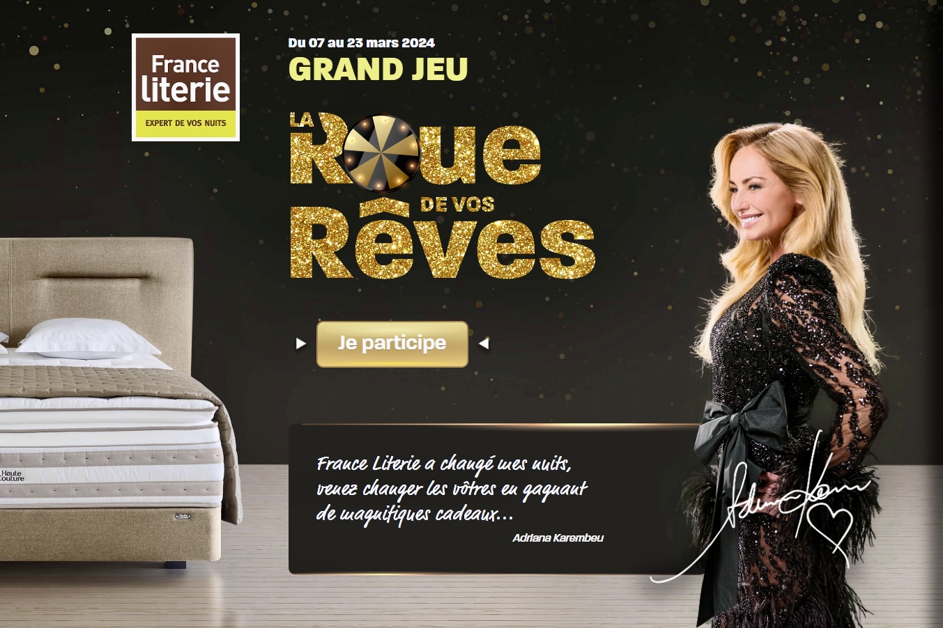 Dans le cadre d’une campagne “Inauguration”, de nombreux outils de communication seront déployés, dont un jeu digital qui sera largement relayé sur les réseaux : “La Roue de Vos Rêves”. Ainsi, du 7 au 23 mars 2024, France Literie met en jeu plus de 30 000 euros de cadeaux… et les joueurs les plus chanceux pourront gagner un séjour de trois nuits à Marrakech (Maroc), dans l’hôtel de luxe cinq étoiles d’Adriana Karembeu, égérie de l’enseigne !