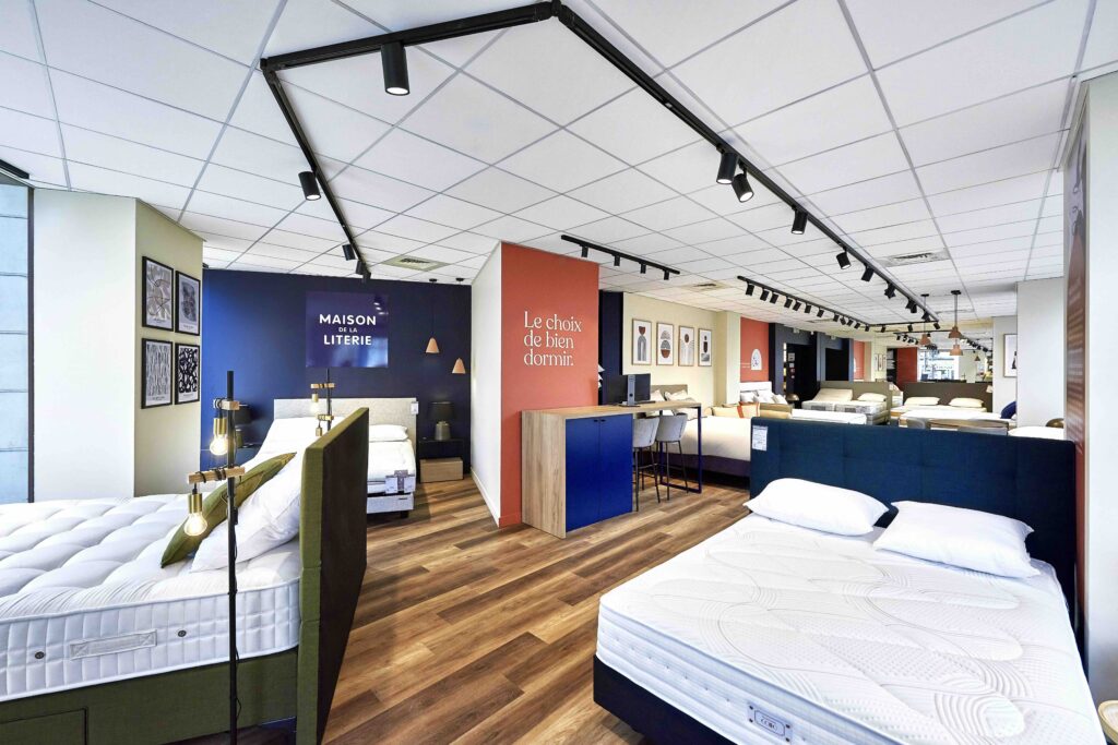 – L’idée fondatrice de ce nouveau concept consiste à remettre le client au centre de notre démarche. Pour ce faire, notre premier objectif a été de retravailler tous les éléments qui concourent à l’ambiance générale du point de vente et au parcours client, de telle sorte que celui-ci, à peine la porte du local franchie, se sente bien. Murs, cloisons, sols, plafonds… : grâce à un jeu de couleurs (bleu profond, blanc crème, terra cotta…), de matières (bois, parquet, moquette…) et de lumières (centrées sur les produits), nous avons créé une ambiance à la fois dynamique et chaleureuse, tout en définissant visuellement les différentes zones du magasin, à savoir l’entrée, l’offre literie et la partie linge de lit.