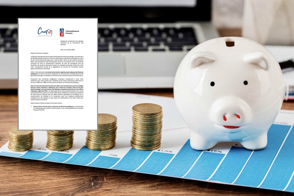 « Dans le cadre du projet de loi de finances 2025, nous souhaiterions que les ménages français soient autorisés à débloquer, pour l’achat de meubles neufs et de gros électroménager neuf, une fraction de l’épargne actuellement placée sur leurs Plans d’épargne logement (PEL). Ce déblocage serait rendu possible pendant une courte durée à déterminer et dans une limite maximale de 10 000 euros. Toutes les simulations de cette mesure indiquent que ses effets seraient significatifs et immédiats sur la consommation de meubles et la croissance, avec une incidence extrêmement marginale pour les banques et sans risque de revendication d’une telle mesure par d’autres secteurs d’activité. »
