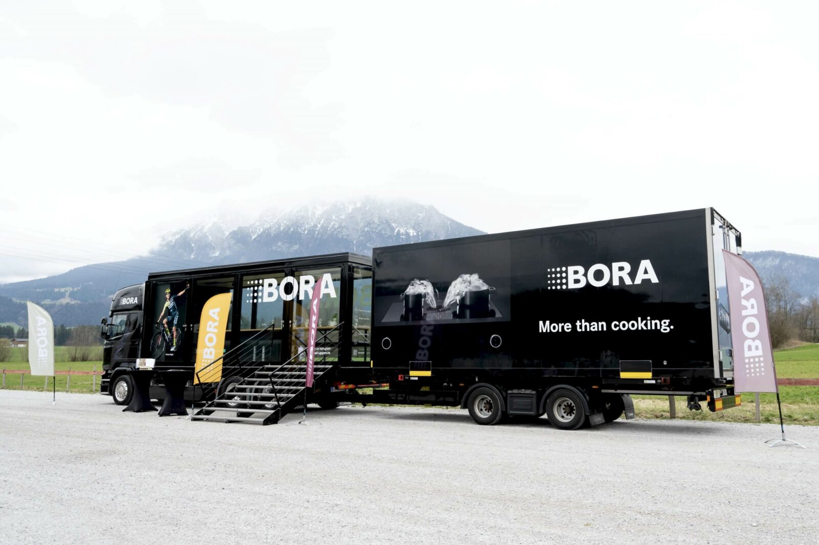 Depuis sa première apparition (en 2015), le “Bora Cooking Truck” vitré a parcouru des milliers de kilomètres à travers l’Europe. Avec ses 19 mètres de long, ses dix roues et un poids total de 32 tonnes, « il allie design impressionnant et fonctionnalité pratique », concluent les communicants de la marque. Le cube de verre et la remorque servent d’espace événementiel mobile, souvent prolongé à l’extérieur par des tables hautes. En 2024, le camion a parcouru 22 000 kilomètres, porté 151 journées d’événements et visité dix pays.