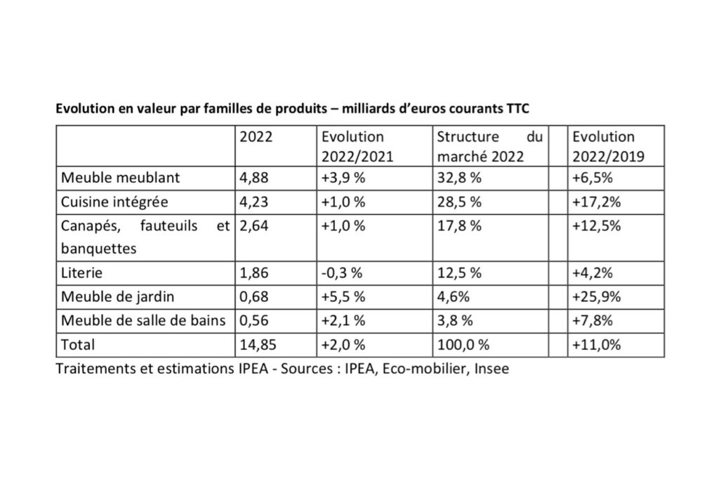 Les chiffres révélés ce jour par l’IPEA (Institut de prospective et d’études de l’ameublement) confirment les pronostics : après une année marquée par l’inflation et la guerre en Ukraine, les ventes de mobilier n’ont certes pas fait d’étincelles en 2022, mais se maintiennent, avec une croissance en valeur de 2 %, pour un chiffre d’affaires global du marché qui se stabilise juste en dessous des 15 milliards d’euros.