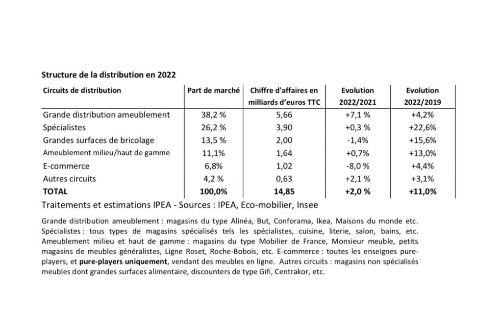 Les enseignes de l’ameublement milieu/haut de gamme (magasins du type Mobilier de France, Monsieur Meuble, petits magasins de meubles généralistes, Ligne Roset, Roche Bobois, etc.), enregistrent également une croissance de leurs ventes sur l’exercice 2022 (+0,7 %, pour 1,64 Md€ de chiffre d’affaires), bien loin toutefois de celle de la grande distribution ameublement. « Le circuit parvient à maintenir ses ventes sur ses deux marchés principaux que sont le meublant et les sièges rembourrés », souligne l’IPEA.