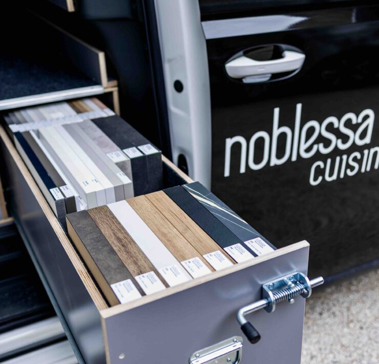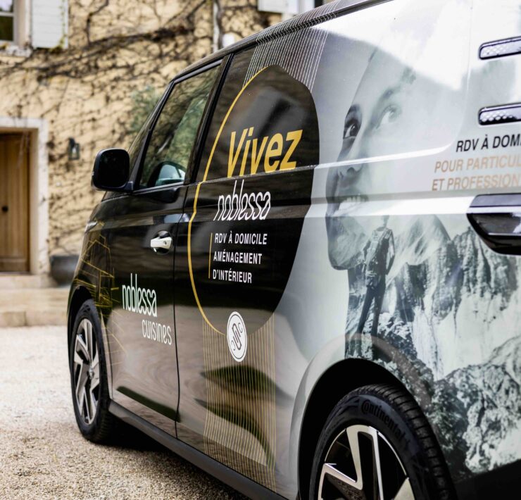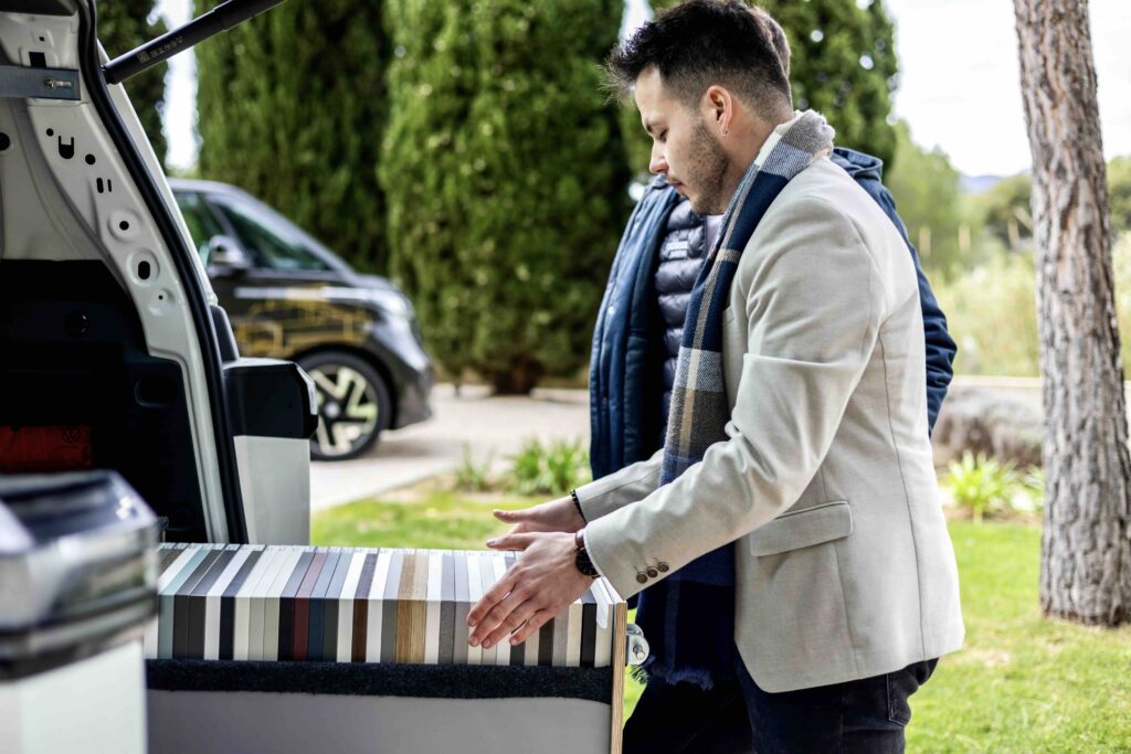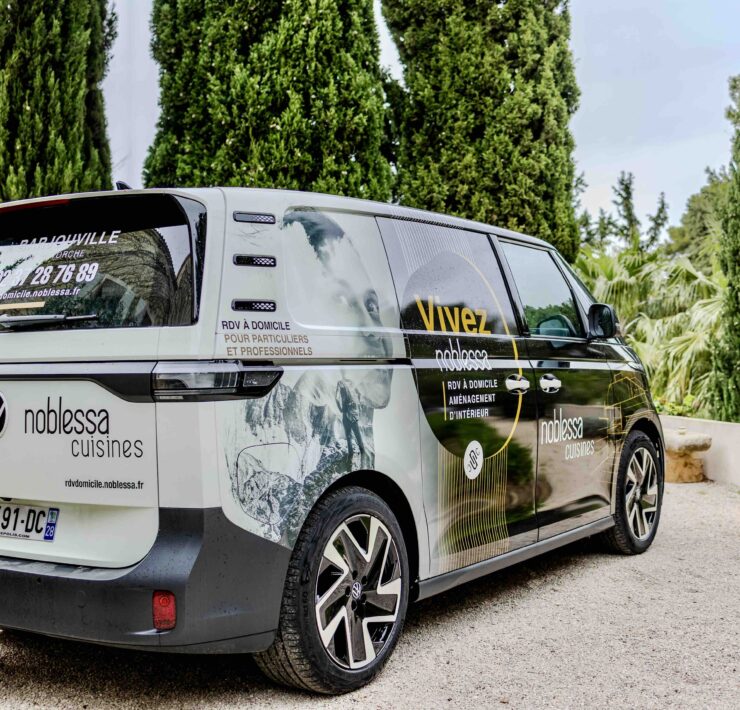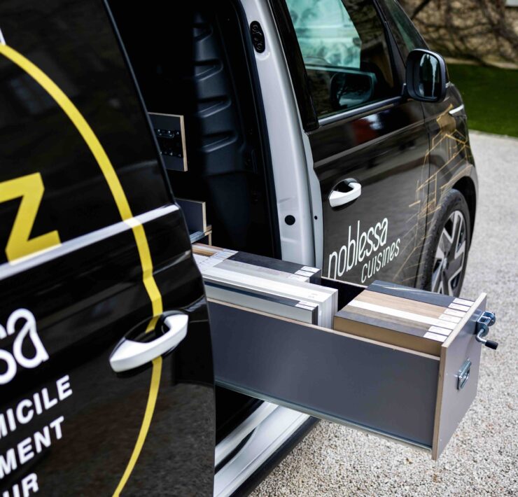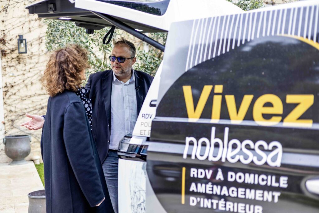 Ainsi, pour les clients qui le souhaitent, c’est à bord d’un “ID. Buzz”, le célèbre combi Volkswagen, remasterisé et électrique, que le concepteur va se déplacer (voir aussi notre galerie d’images ci-dessus). Grâce à ce véhicule, floqué aux couleurs de noblessa bien sûr, mais surtout équipé et aménagé d’échantillons, l’expert noblessa va pouvoir présenter produits, matériaux, solutions d’aménagement, directement chez le client et apporter à celui-ci, de façon “délocalisée” par rapport au point de vente en quelque sorte, l’ensemble des conseils et études de projets susceptibles d’emporter son adhésion.