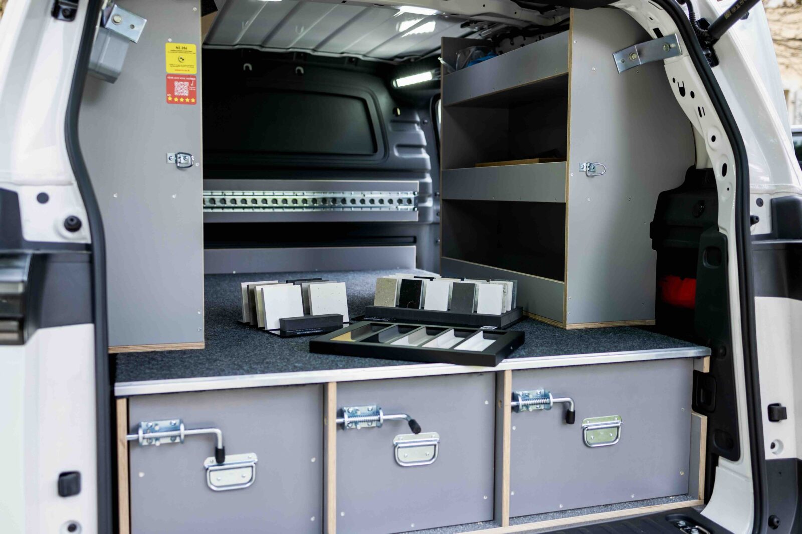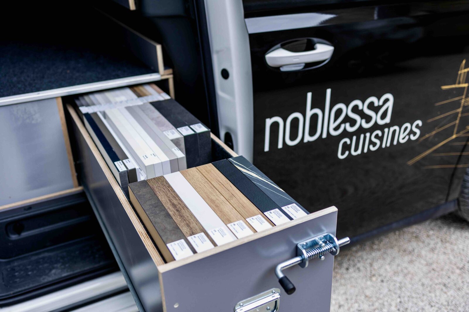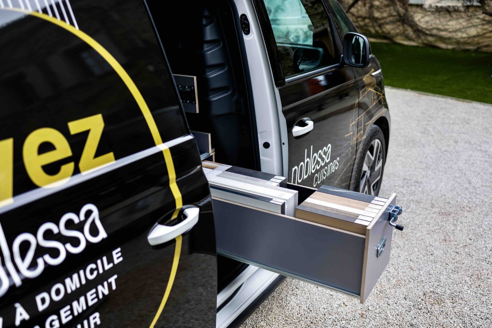 Ainsi, pour les clients qui le souhaitent, c’est à bord d’un “ID. Buzz”, le célèbre combi Volkswagen, remasterisé et électrique, que le concepteur va se déplacer (voir aussi notre galerie d’images ci-dessus). Grâce à ce véhicule, floqué aux couleurs de noblessa bien sûr, mais surtout équipé et aménagé d’échantillons, l’expert noblessa va pouvoir présenter produits, matériaux, solutions d’aménagement, directement chez le client et apporter à celui-ci, de façon “délocalisée” par rapport au point de vente en quelque sorte, l’ensemble des conseils et études de projets susceptibles d’emporter son adhésion.