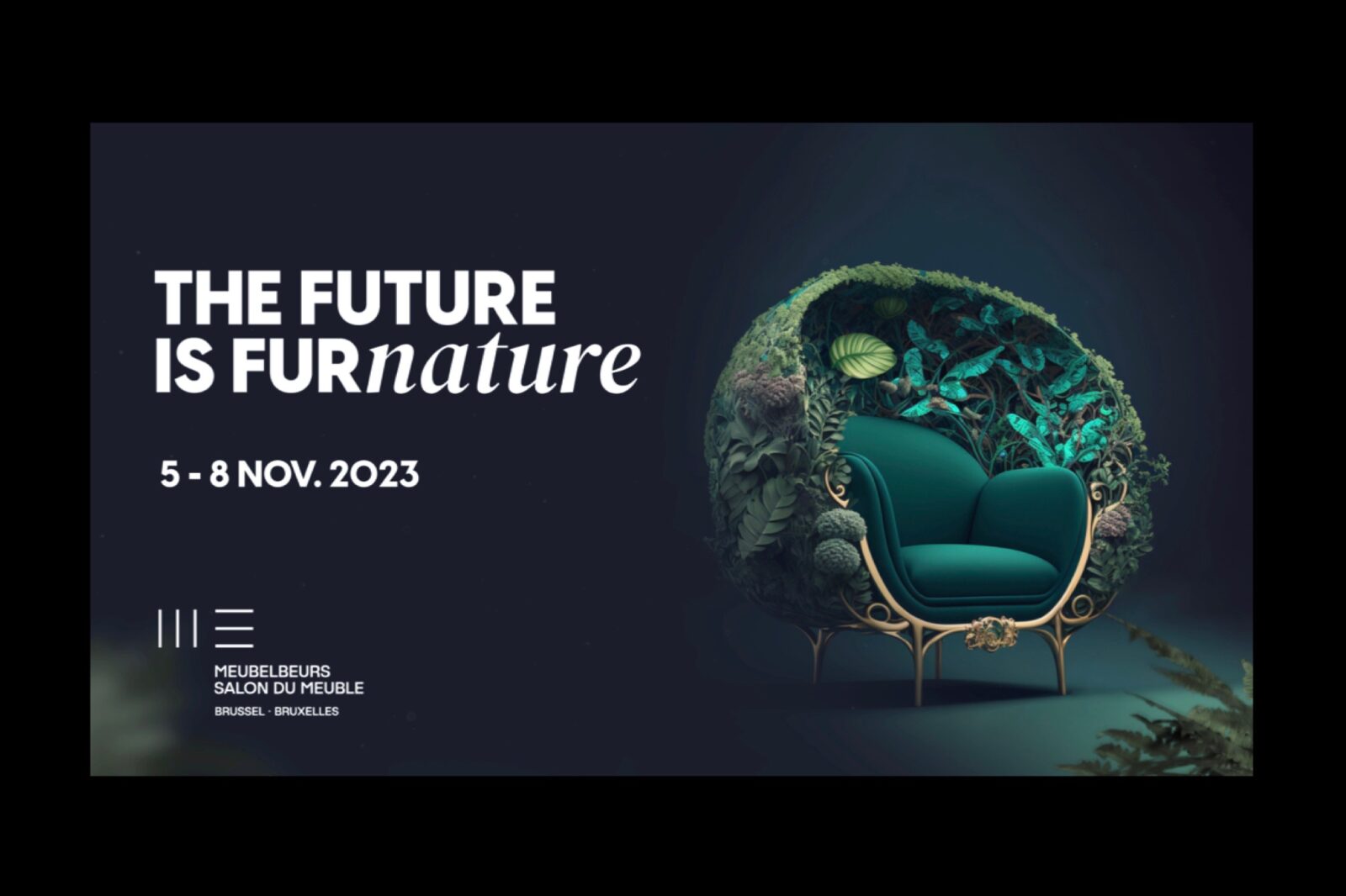 Thomas Hibert, responsable marketing et communication du Salon du Meuble de Bruxelles (qui se tiendra du 5 au 8 novembre prochain au parc Brussels Expo), a révélé le principal axe de communication choisi par les organisateurs du rendez-vous outre-Quiévrain pour mettre en avant cette édition 2023 : un fauteuil tout de vert vêtu, agrémenté d’une armature dorée façon style Art nouveau, le tout niché, tel un fauteuil œuf, dans une coque constituée d’un enchevêtrement de végétaux ; et un slogan, « THE FUTURE IS FURnature », fondé sur un néologisme construit autour de “nature” (nature) et “furniture” (meubles), mais qui peut tout aussi bien faire penser à une revendication : « for nature »… Et si la manifestation belge était cette année, si ce n’est le salon des “furniture” pour la nature, en tous cas le salon des “furniture” respectueux de cette nature ?