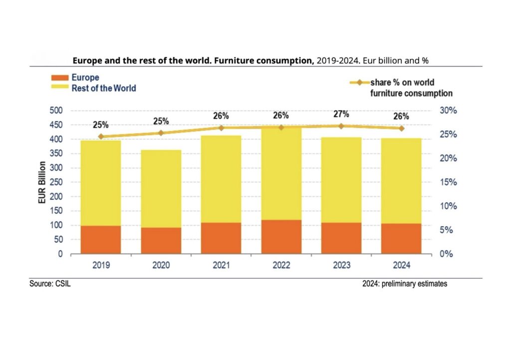 Par voie de communiqué, le Csil nous rappelle ainsi que l’Europe, deuxième plus grand marché du meuble dans le monde, avec une valeur de consommation d’environ 106 milliards d’euros (plus d’un quart du marché mondial), continue d’occuper une position cruciale dans l’industrie mondiale de l’ameublement, agissant comme une plaque tournante en termes de production, de taille de marché et de commerce mondial.