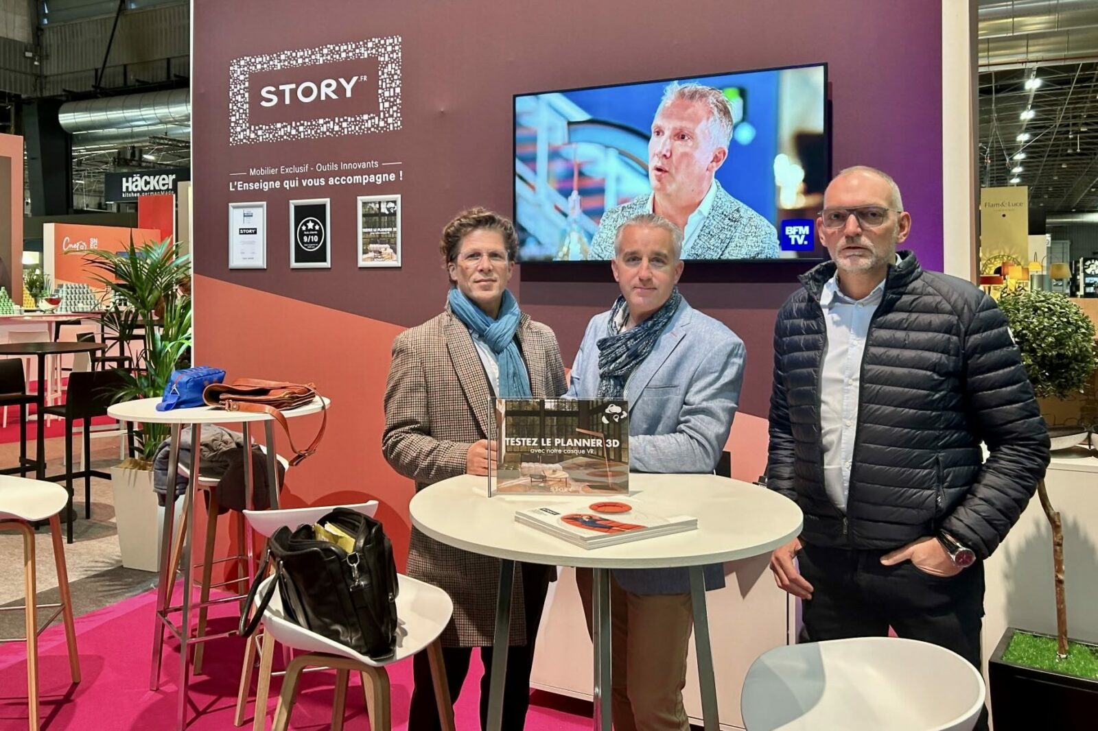 Notre photo d’ouverture : sur le stand Story, lors du dernier salon EspritMeuble (de gauche à droite), James Vanderhooft, Anthony Bodereau et Stéphane Bardoult.
