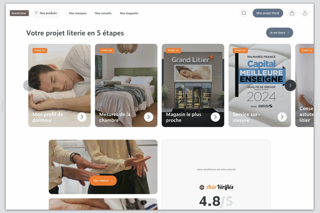 Le site “grandliter.com”, initialement orienté e-commerce, propose désormais une approche plus servicielle et largement optimisée pour générer du trafic en point de vente. Pièce maîtresse de cette démarche : la rubrique “Mon projet literie en 5 étapes”, qui personnalise le parcours de l’internaute.