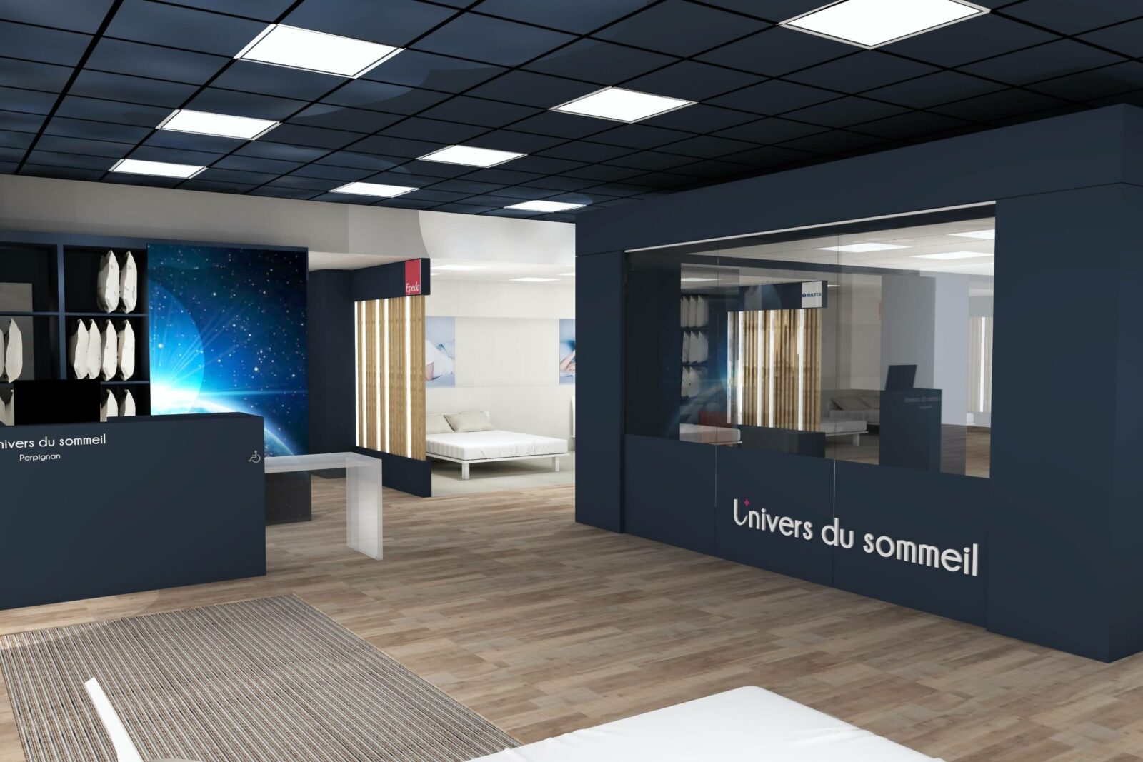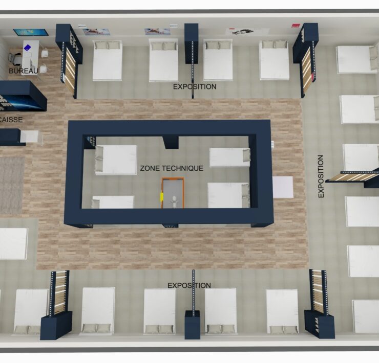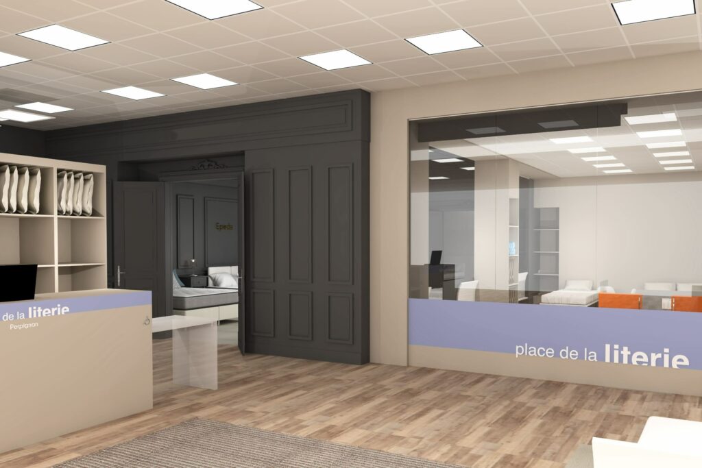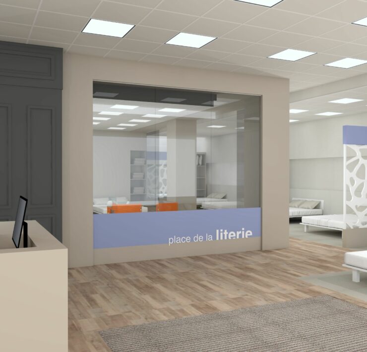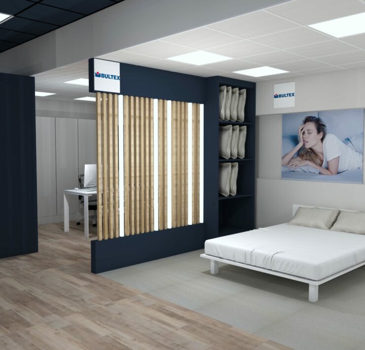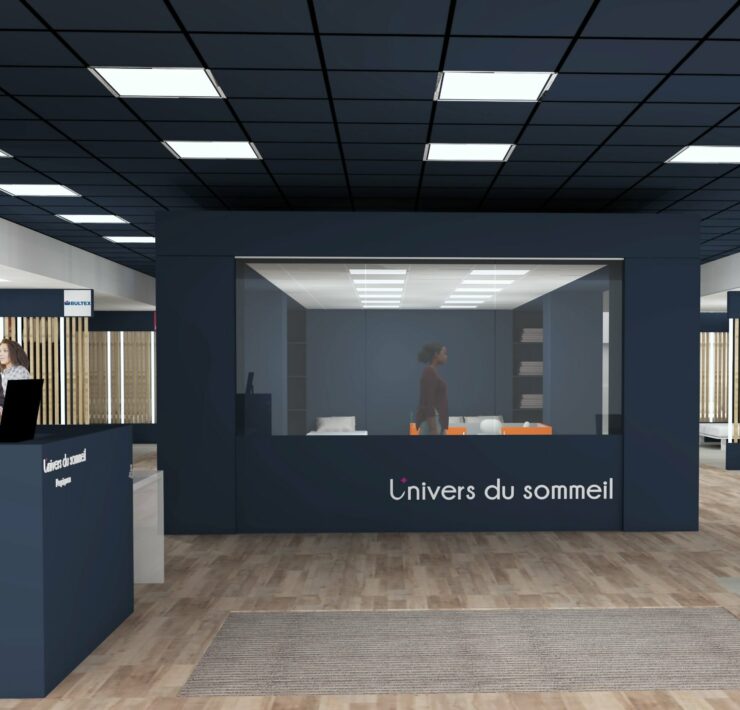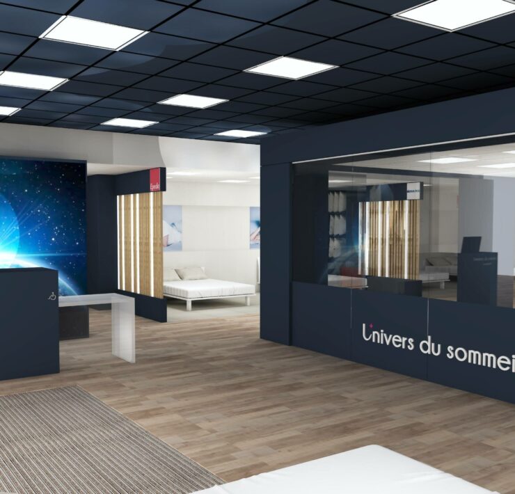 Côté Univers du Sommeil (principal chantier), le concept va s’appuyer sur des univers de marques. Les gammes (exclusives à l’enseigne), seront donc présentées par marque, au travers de box dédiés et cloisonnés. Au sein de chaque box, dans lesquels les produits seront exposés par conforts et par prix, la marque exprimera son histoire et son identité. Dans cet espace, la marque concernée offrira en outre aux vendeurs, grâce à des échantillons de démonstration (mousse, latex, ressorts…), la possibilité d’expliquer de manière simple les propriétés intrinsèques de chaque technologie de confort. À gauche immédiatement après l’entrée du point de vente : le comptoir d’accueil et la caisse. Au centre du magasin : une « zone technique », consacrée exclusivement aux TPR ; et délimitée par des cloisons vitrées, de manière à attirer le regard des chalands. Ici, les sommiers électriques seront présentés avec un seul matelas, de 80×190 cm, de manière à ménager un accès visuel immédiat aux technologies TPR ; par ailleurs, toujours dans cette zone TPR, d’autres matelas 80×190 cm seront disponibles dans un mobilier dédié, afin, le cas échéant, de pouvoir les positionner sur le sommier et tester un deuxième confort ; ici en d’autres termes, ce ne sont pas les marques les vedettes, mais la technologie !