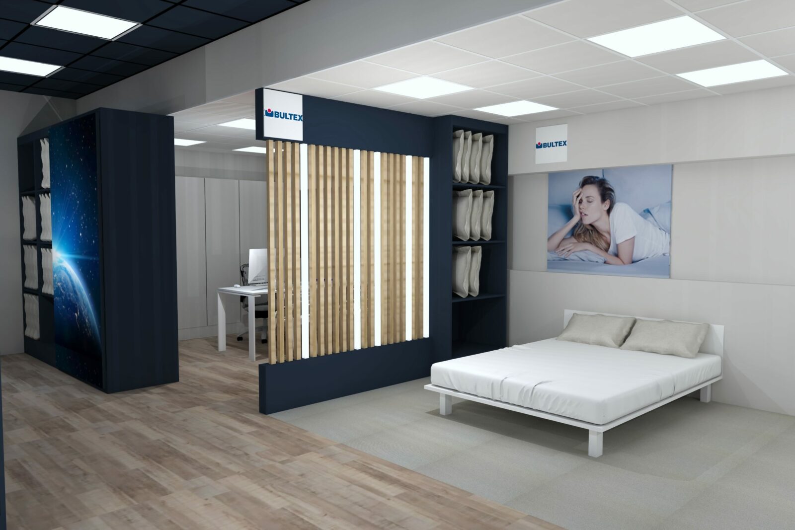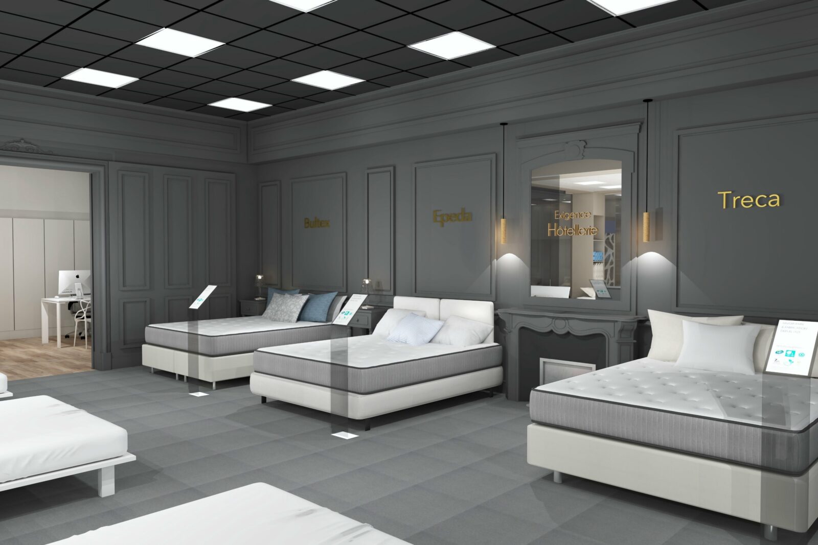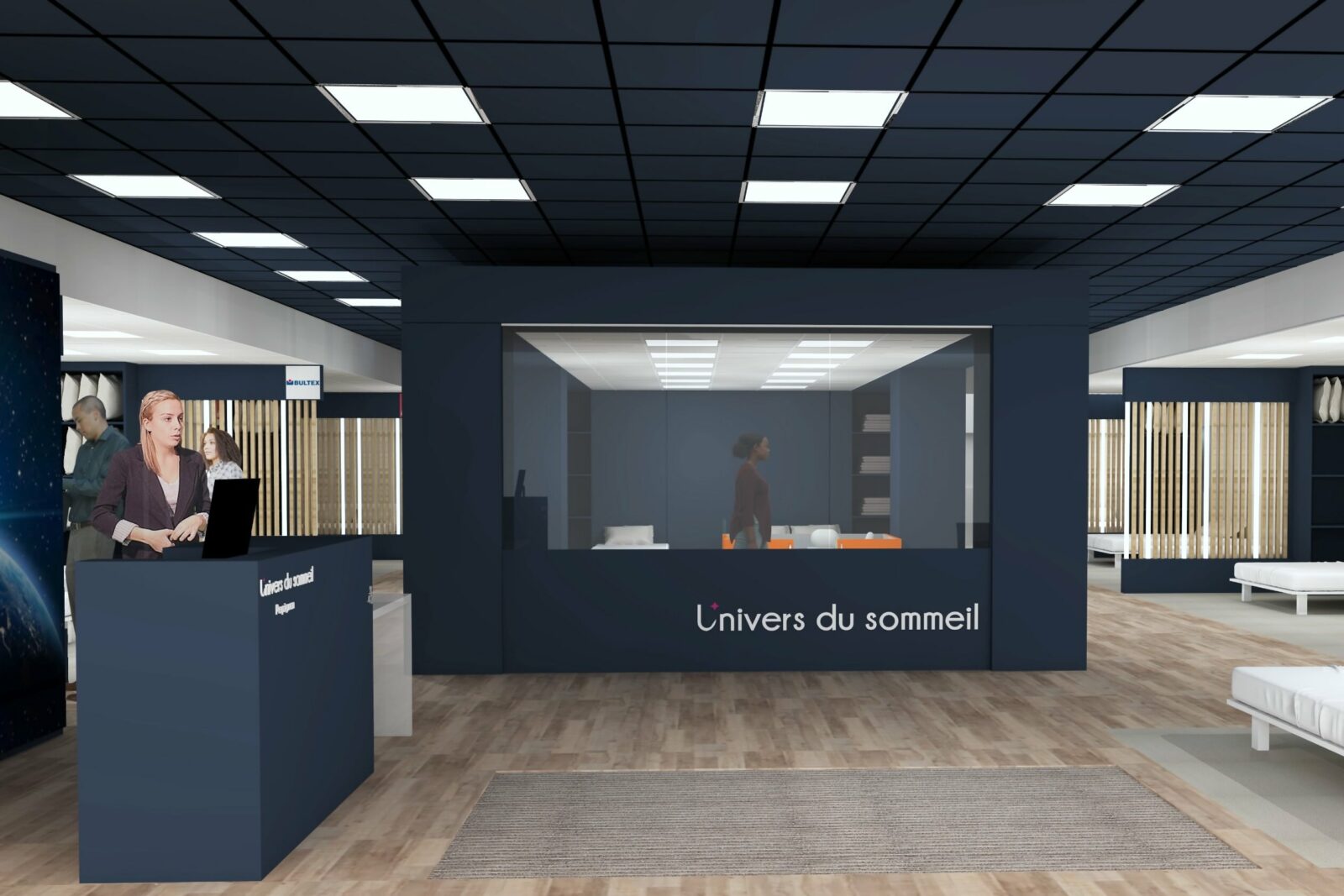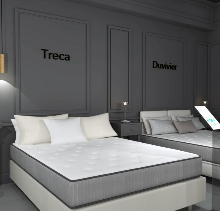 Côté Univers du Sommeil (principal chantier), le concept va s’appuyer sur des univers de marques. Les gammes (exclusives à l’enseigne), seront donc présentées par marque, au travers de box dédiés et cloisonnés. Au sein de chaque box, dans lesquels les produits seront exposés par conforts et par prix, la marque exprimera son histoire et son identité. Dans cet espace, la marque concernée offrira en outre aux vendeurs, grâce à des échantillons de démonstration (mousse, latex, ressorts…), la possibilité d’expliquer de manière simple les propriétés intrinsèques de chaque technologie de confort. À gauche immédiatement après l’entrée du point de vente : le comptoir d’accueil et la caisse. Au centre du magasin : une « zone technique », consacrée exclusivement aux TPR ; et délimitée par des cloisons vitrées, de manière à attirer le regard des chalands. Ici, les sommiers électriques seront présentés avec un seul matelas, de 80×190 cm, de manière à ménager un accès visuel immédiat aux technologies TPR ; par ailleurs, toujours dans cette zone TPR, d’autres matelas 80×190 cm seront disponibles dans un mobilier dédié, afin, le cas échéant, de pouvoir les positionner sur le sommier et tester un deuxième confort ; ici en d’autres termes, ce ne sont pas les marques les vedettes, mais la technologie !