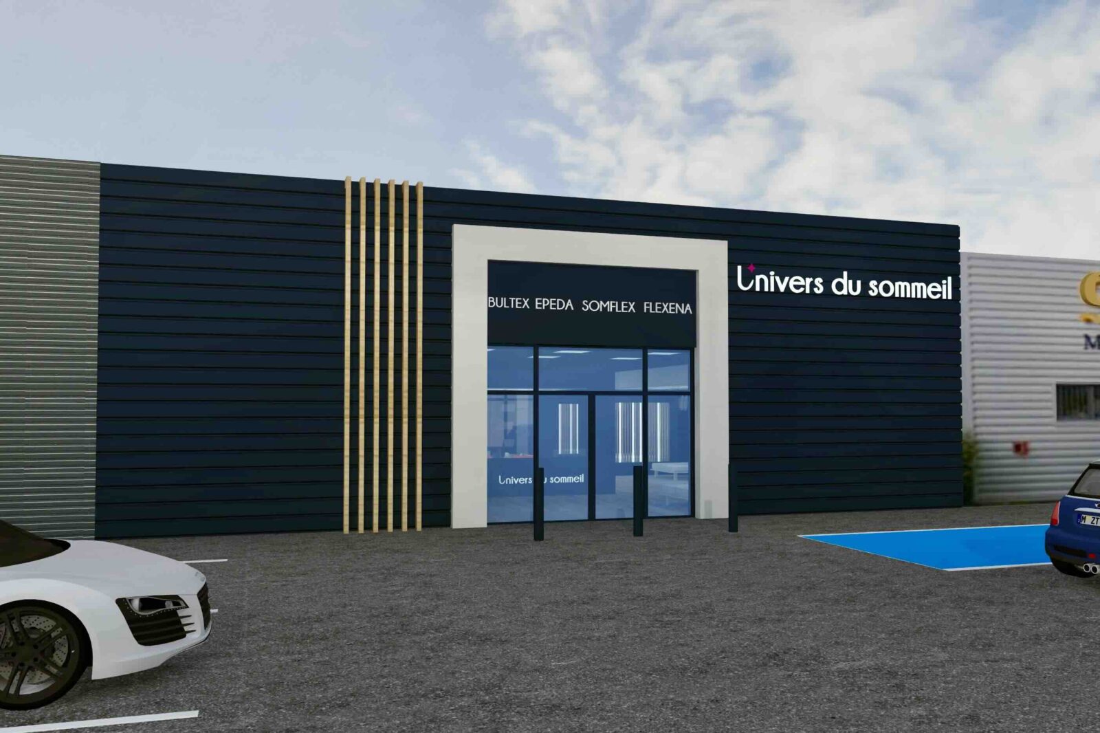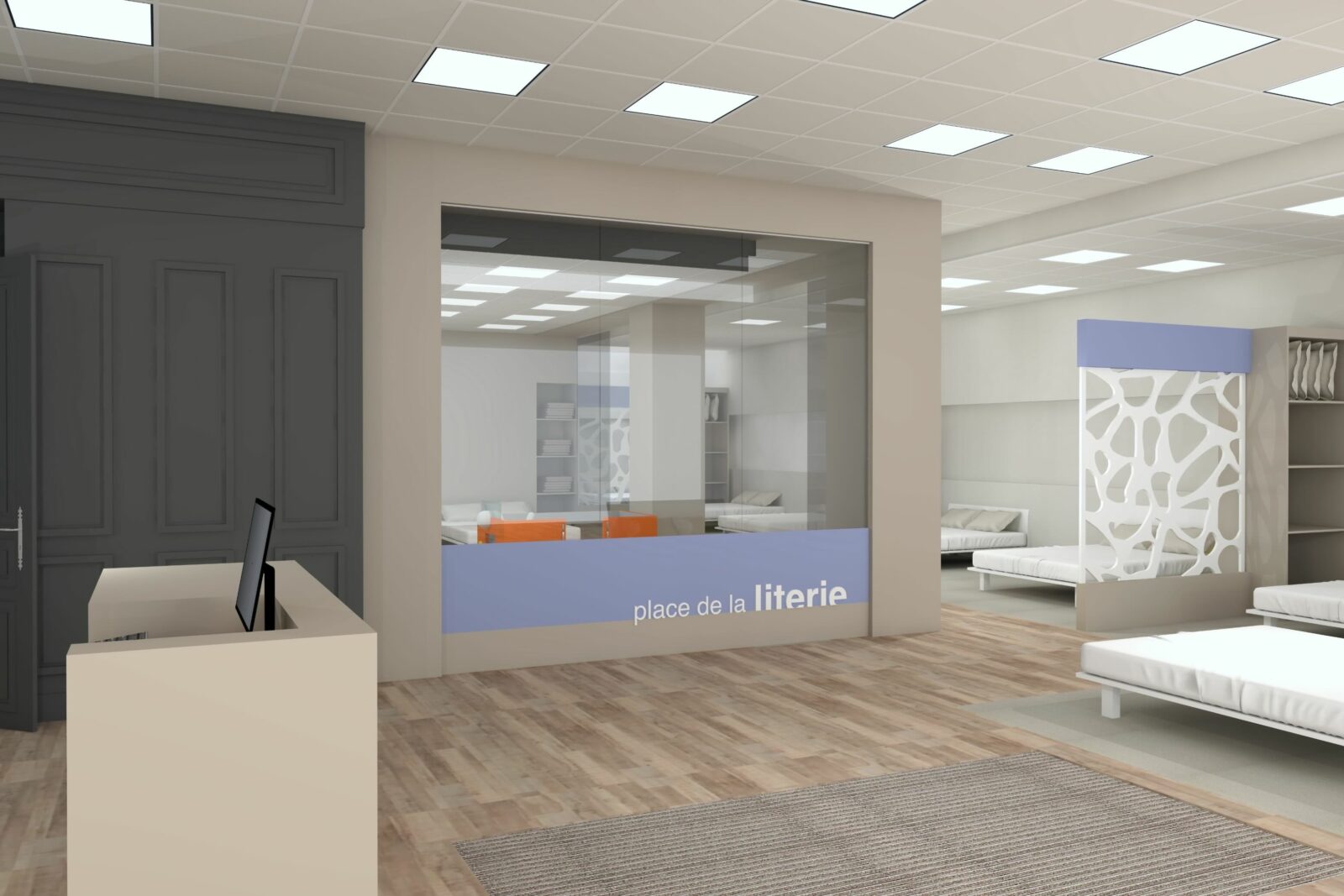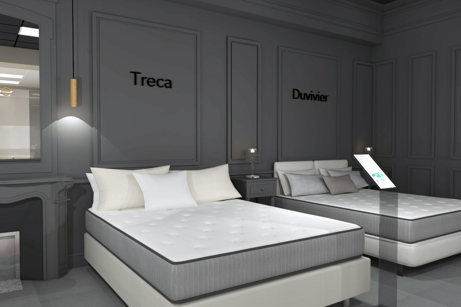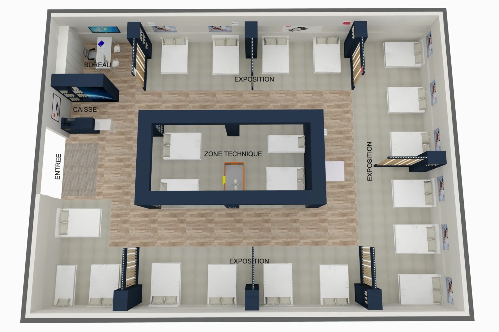 Côté Univers du Sommeil (principal chantier), le concept va s’appuyer sur des univers de marques. Les gammes (exclusives à l’enseigne), seront donc présentées par marque, au travers de box dédiés et cloisonnés. Au sein de chaque box, dans lesquels les produits seront exposés par conforts et par prix, la marque exprimera son histoire et son identité. Dans cet espace, la marque concernée offrira en outre aux vendeurs, grâce à des échantillons de démonstration (mousse, latex, ressorts…), la possibilité d’expliquer de manière simple les propriétés intrinsèques de chaque technologie de confort. À gauche immédiatement après l’entrée du point de vente : le comptoir d’accueil et la caisse. Au centre du magasin : une « zone technique », consacrée exclusivement aux TPR ; et délimitée par des cloisons vitrées, de manière à attirer le regard des chalands. Ici, les sommiers électriques seront présentés avec un seul matelas, de 80×190 cm, de manière à ménager un accès visuel immédiat aux technologies TPR ; par ailleurs, toujours dans cette zone TPR, d’autres matelas 80×190 cm seront disponibles dans un mobilier dédié, afin, le cas échéant, de pouvoir les positionner sur le sommier et tester un deuxième confort ; ici en d’autres termes, ce ne sont pas les marques les vedettes, mais la technologie !