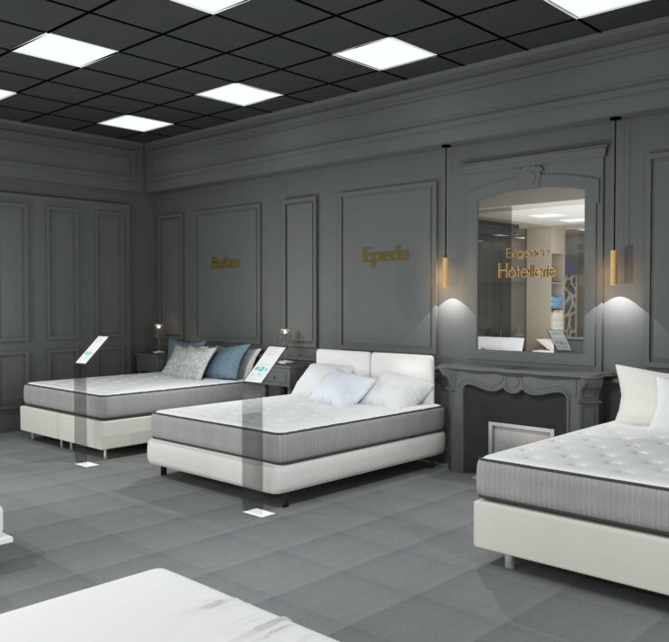 Côté Place de la Literie (concept qui, dixit son directeur d’enseigne, « fonctionnait déjà très bien »), pas de “révolutions” à proprement parler, mais des évolutions notoires. Les points de vente vont être divisés en trois zones de gammes : “Économes”, “Essentiels” et “Exigeants Hôtellerie”. Comme son nom l’indique, la zone “Économes” sera consacrée aux offres “premiers prix” (jusqu’à 1 000 euros maximum), avec des produits présentés en 140×190 cm (+ sommiers tapissiers de 15 cm de hauteur et dosseret en 140), toutes marques et matières confondues. La zone “Essentiels” (correspondant au “cœur de gamme”), concernera des produits présentés en 160×200 cm (+ sommiers tapissiers tissu déco de 20 cm ou coffre et têtes de lit plus hautes et débordantes), selon une fourchette de prix allant de 1 000 à 2 000 euros. Quant à la zone “Exigeants Hôtellerie”, là aussi comme son nom l’indique, elle sera dédiée à des gammes dignes des plus grands hôtels, présentées en 160 et 180 cm (+ sommiers tapissiers de 20 ou 25 cm et dosserets “hôtellerie”), avec cette fois une fourchette de prix de 2 000 euros à plus.