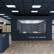 Dans les parties les moins porteuses du point de vente : une « zone enfant » (pour occuper les plus petits tandis que leurs parents progressent sereinement dans leur projet d’achat) et un « espace collation » (boissons, café, mignardise…), pour la convivialité, non loin de la table de travail. Le plafond ? : abaissé, pour créer une sensation de “cocon”. Les sols ? : exit les moquettes siglées à l’enseigne ; parquet pour les zones de passage, moquette dans les box. Signalons enfin que l’enseigne disposera de sa propre marque distributeur (“Univers du Sommeil”), à la fois pour compléter les parties de gammes non-assurées par les marques nationales et pour dégager davantage de marge sur certaines références (notamment en matière d’accessoires para-literie).